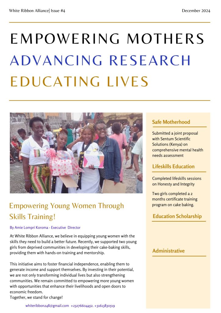By Amie Lompri Koroma – Executive Director At White Ribbon Alliance Sierra Leone (WRA-SL), we believe that investing in young women is a direct investment in the future of our nation. Our commitment to equipping girls with the skills and confidence they need to thrive is a central part of our mission to promote safe motherhood, strengthen communities, and improve health outcomes. Recently, WRA-SL supported two young women from underprivileged communities by helping them acquire hands-on skills in cake-baking. Through structured training and close mentorship, these girls successfully completed a two-month certificate program. This training not only boosted their self-confidence but also opened new doors to financial independence and personal growth.